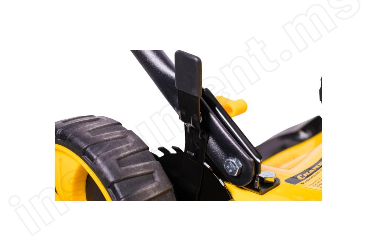 - pегулировка высоты скашивания производится с помощью рычага под каждым колесом.
